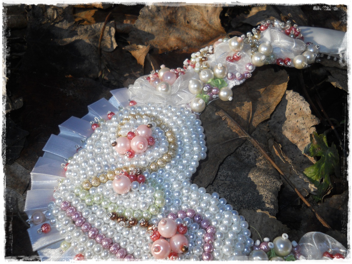 'presarate' cu perlute texturate.Se leaga la spate cu funda din panglica